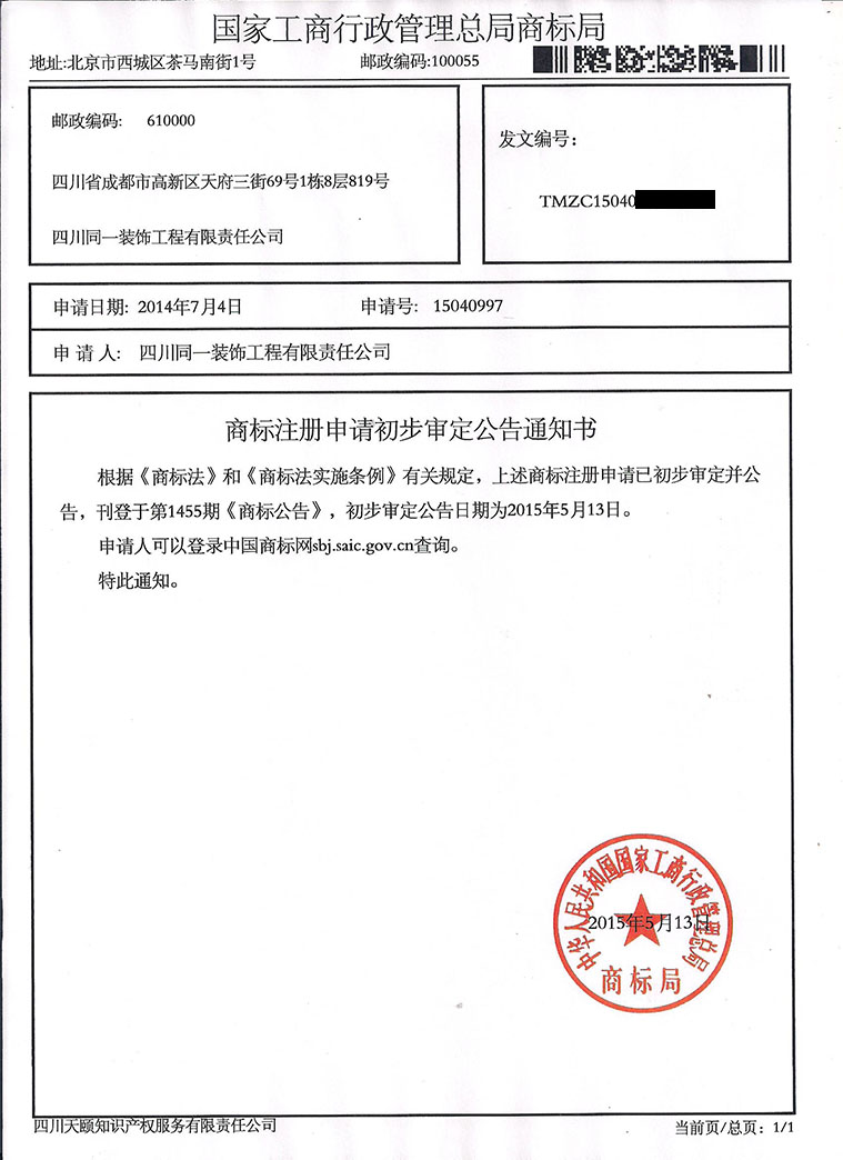 我司商标注册经审定正式予以公告