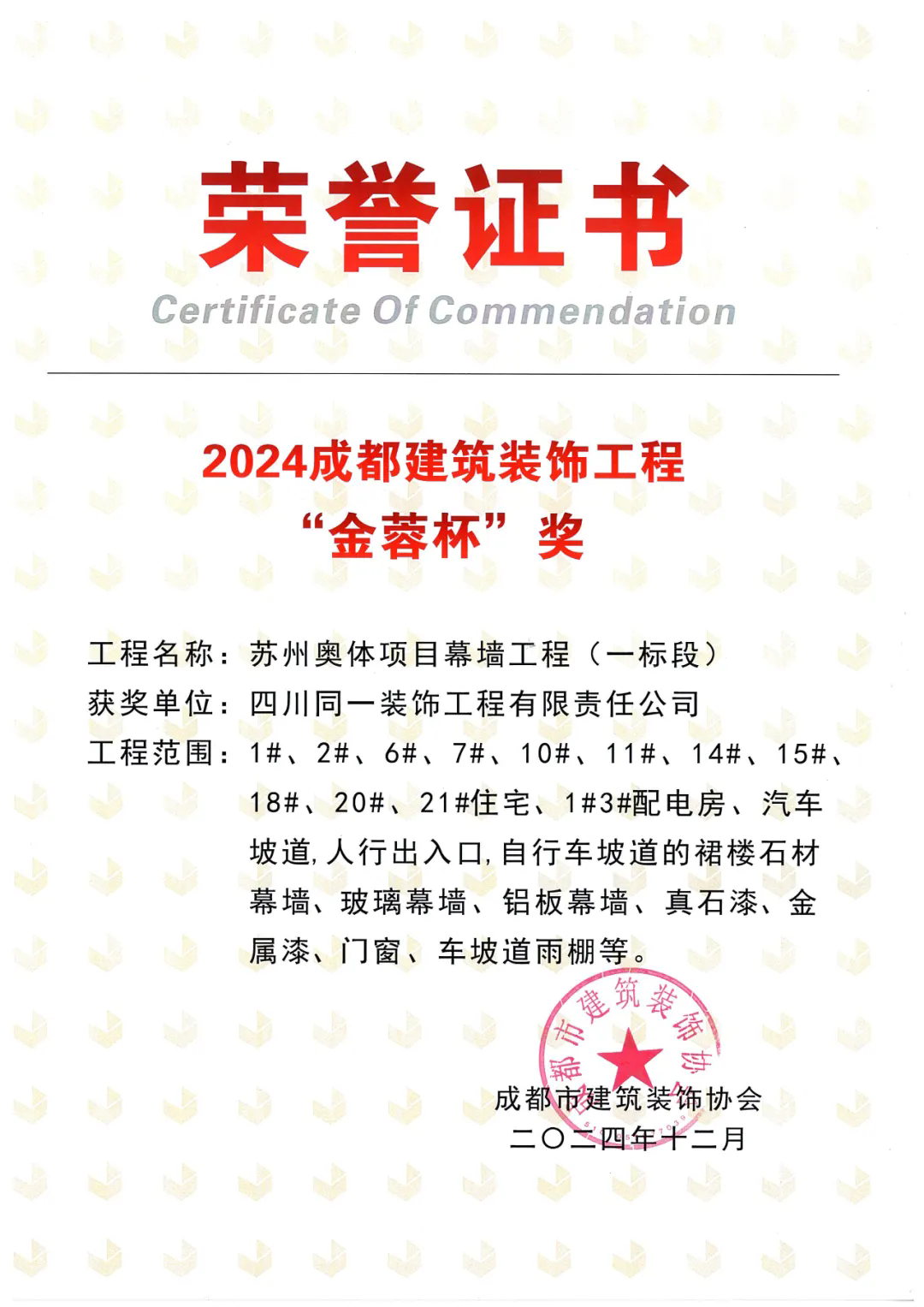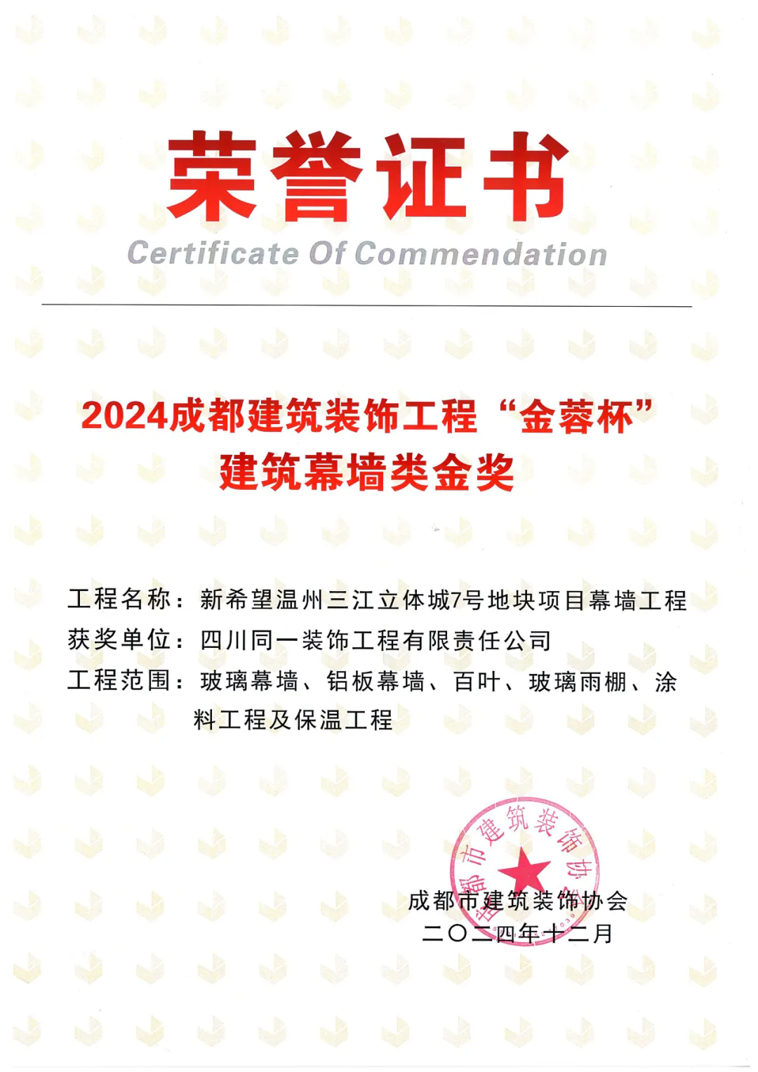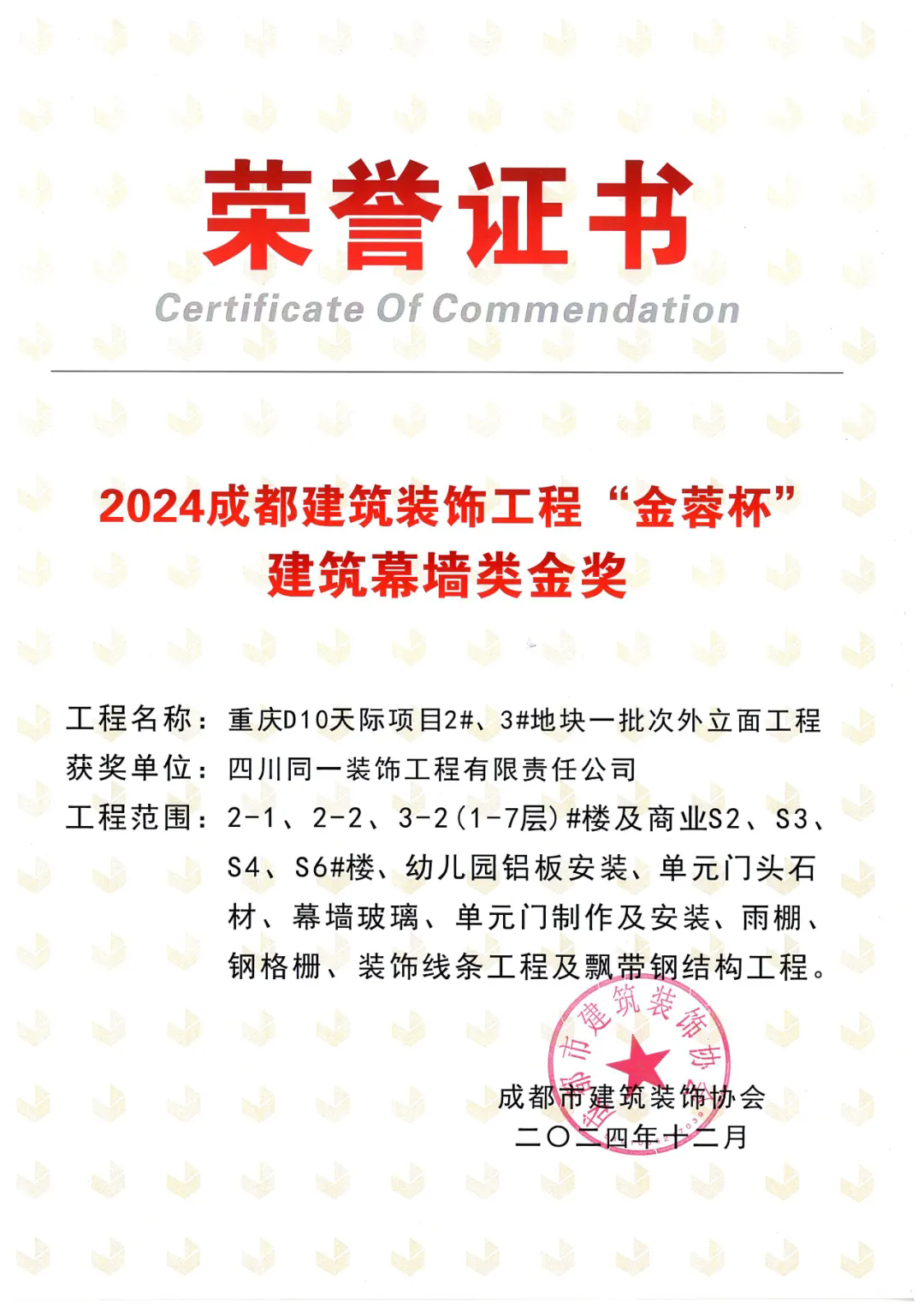 在颁奖环节,同一装饰再度获评年度“先进企业”,而且四个参评项目均获得了奖项,其中“新希望温州三江立体城7号地块项目幕墙工程”和“重庆D10·天际项目2#、3#地块一批次外立面工程”还被评选为了“金蓉杯”建筑幕墙类金奖项目!
