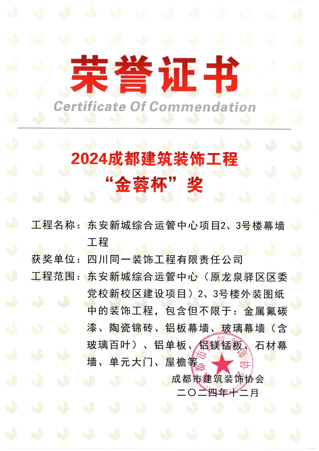 为进一步推动成都建筑装饰行业技术革新及转型升级,总结推广优质工程在设计、施工及管理方面的经验,成都市建筑装饰协会于2024年12月27日,在成都天府匠芯总部中心举行了“2024成都建筑装饰工程技术交流会暨行业颁奖典礼”,同一装饰董事长杨明及公司工程部门负责人受邀参加了本次会议。