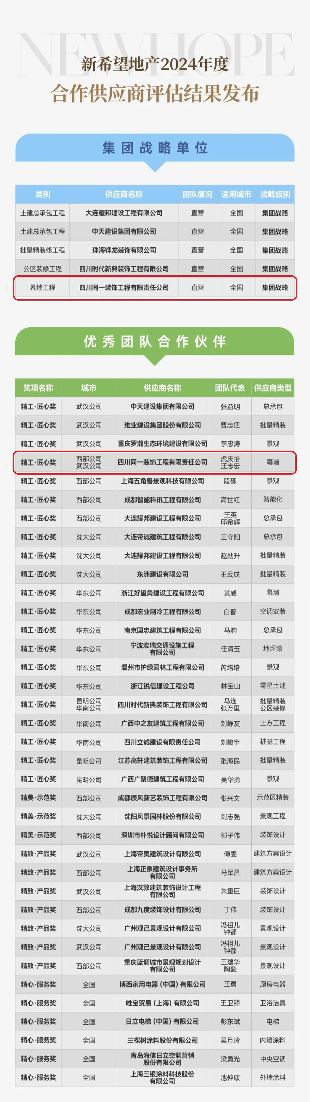 四川同一装饰工程有限责任公司作为新希望地产连续多年的优秀供应商,在2024年度评比中,再次荣获新希望地产幕墙工程类“集团战略”称号。并且,同一装饰武汉项目团队及昆明项目团队,还分别荣获了新希望地产“精工·匠心奖”。